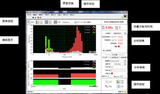 De test- en analyse-interface toont de amplitude en frequentie van verschillende centrale frequentiebanden met 1 ≤ 3 octaaf, de gegevens geanalyseerd met de Wh-methode en 1 ≤ 3 octaafmethode, en laat zien dat de trillingsemissiewaarde aH, onzekerheid K en variatiecoëfficiënt Cv , zijn in goede overeenstemming met de standaardeisen door de meting van de handgreep van het gereedschap.